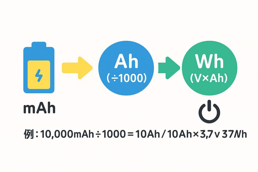 例:10,000mAh×3.7V=約37Wh。飛行機や“持ち時間”の比較はWhで考えるとラクです。