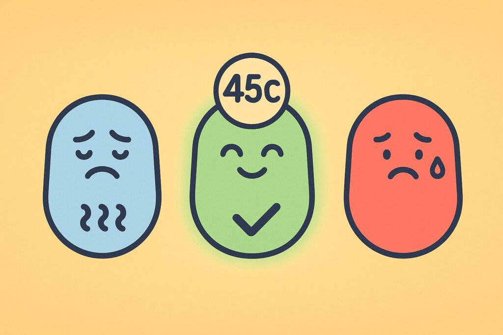 まずは低温(約45℃前後)からお願いします。冷えが強い場面だけ一段上げて、落ち着いたらまた低温へ戻す“上げて→戻す”運用が安全で長持ちです。直肌ベタ当てはNG。布カバーや薄手手袋を挟むのがコツです。