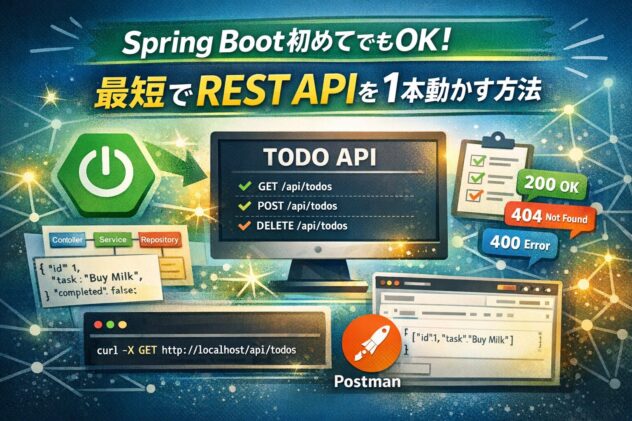 Spring BootでREST APIを作りたいけど最短ルートが分からない…そんな人向けに、TODO API(追加・一覧・削除)を1本作ってcurl/Postmanで動作確認まで進めます。Controller/Service/Repositoryの役割、DTO、エラーの返し方、CORSの基本もやさしく解説。