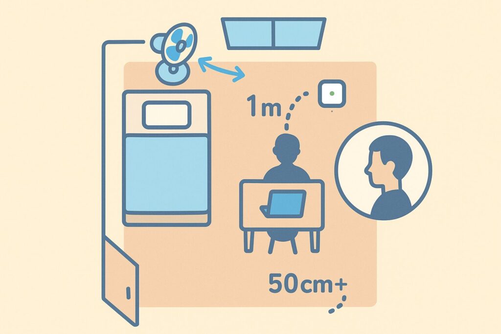 家族やペット同室の時間帯は、据置きを人の息から50cm以上離す位置に固定し、前倒し換気を1本差し込みます。手元用は各自の席に移動させ、通知は光のみで静かに回してください。