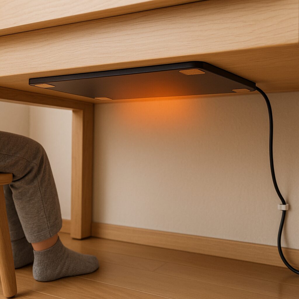 天板裏からじんわり温める方式。足元空間が広くなり、コード露出も少なめ。低温設計のモデルを選ぶと子ども向けに相性◎です。