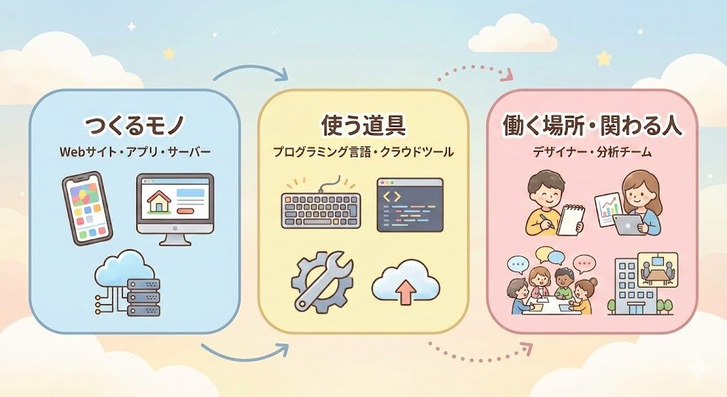 エンジニアの違いをざっくり説明するなら、「つくるモノ」「使う道具(スキル)」「働く場所や関わる人」の3つがポイントです。ここを押さえるだけで、職種の違いがめちゃくちゃ理解しやすくなります。
