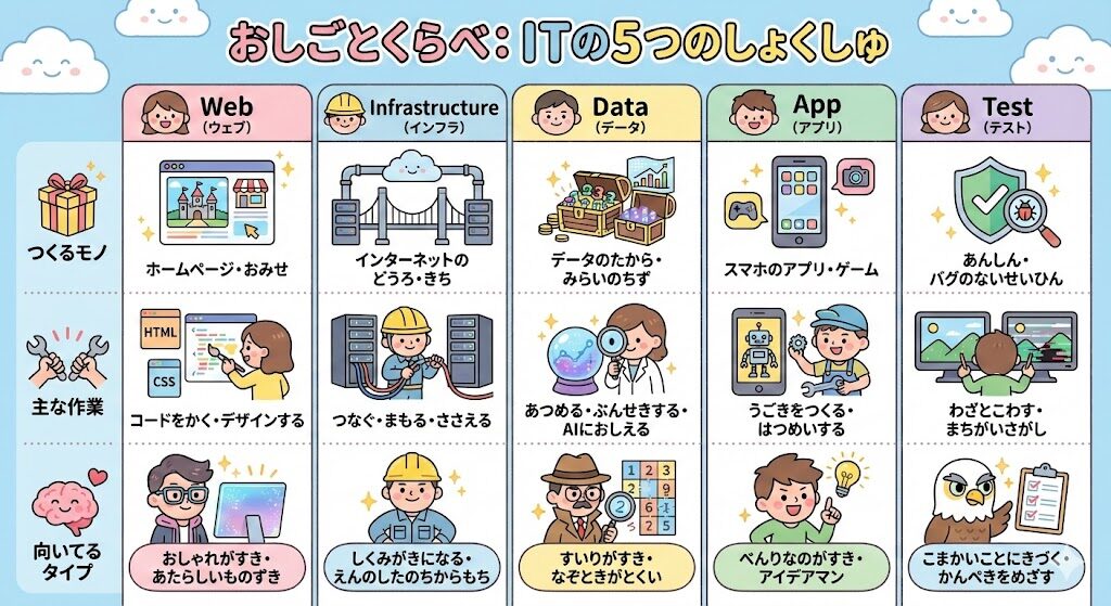 エンジニアとひとことで言っても、実は中身はぜんぜん違います。ここでは、特に出会いやすい代表的な5つの職種を、同じフォーマットでサクッと比較していきます。「何をつくる?」「どんな作業が多い?」「どんな人に向いてる?」をセットで見ると理解が一気に進みますよ。