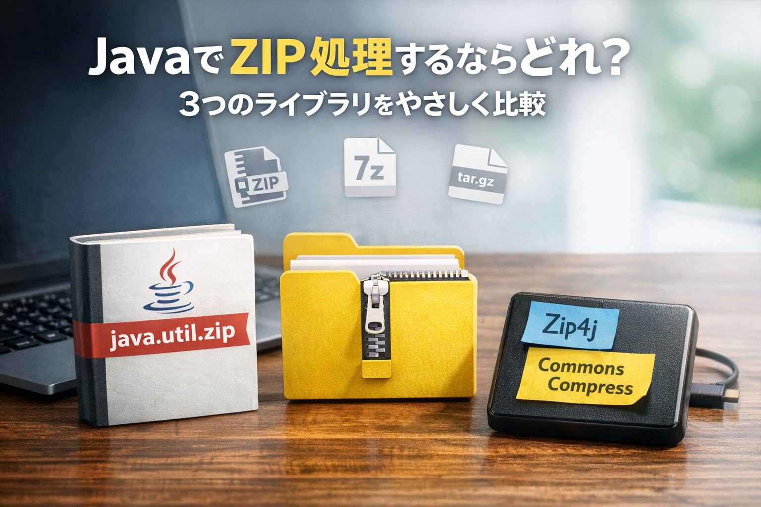 そのうえで、機能が足りないと感じたときに Commons Compress や Zip4j を検討すると、ライブラリ選びで迷いにくくなります。