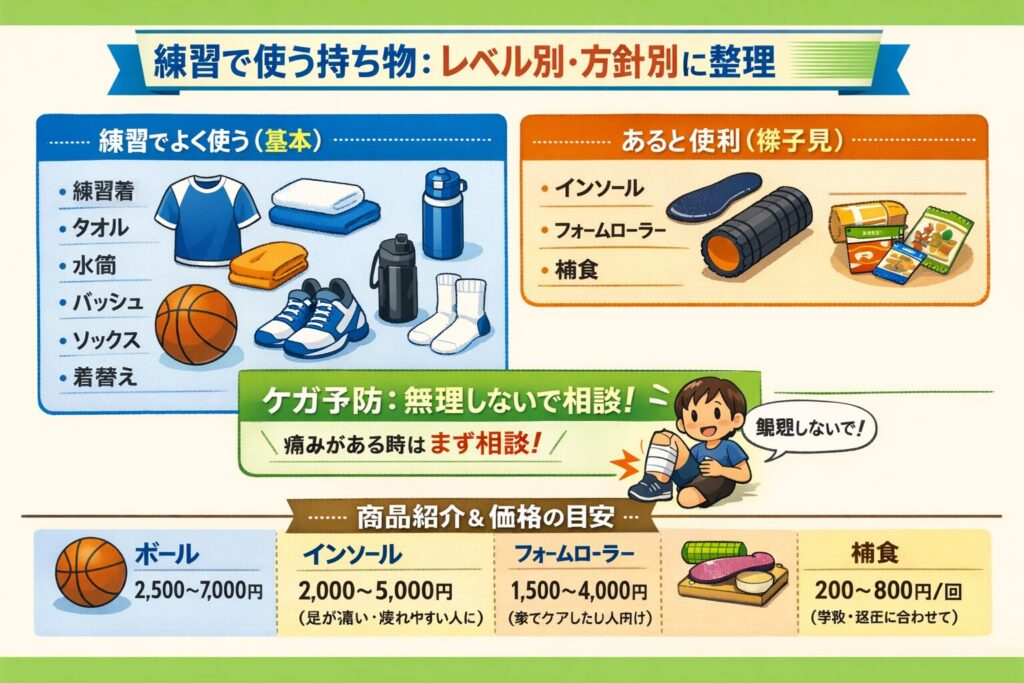 大丈夫です。 最初は「絶対セット(5〜7個)」だけで回して、困ったら足すのが正解です。チームの指定がある物もあるので、いきなり買うとムダになりやすいです。