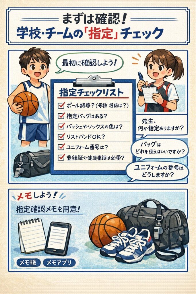 読み終わるころには、「今日は練習だからこれ」「試合ならこれ追加」と、迷わず準備できるようになりますよ。さっそく、最初に確認すべき“指定チェック”からいきましょう!
