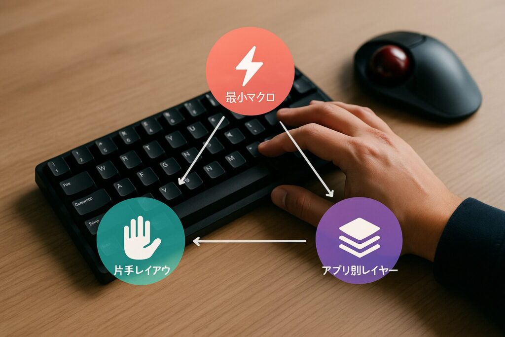 なります。コツは届く配置(Caps=親指キー+IJKL矢印)と、反復を束ねる最小5マクロ、そしてアプリ別レイヤーです。効果の%は環境差があるため、同じ作業をBefore/Afterで計測して判断してください。