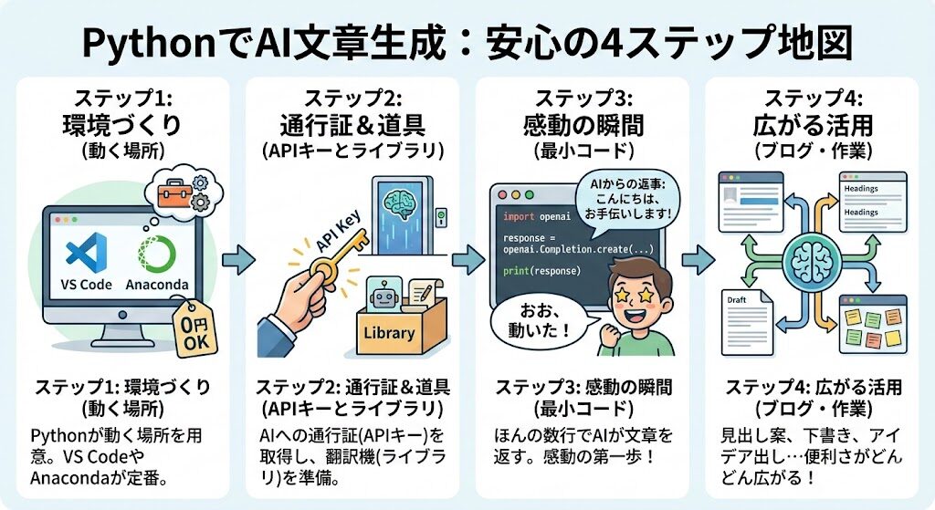 PythonでAIに文章を書いてもらうまでの流れって、実はたった4つのステップに分けられるんです。いきなり全部を理解しようとすると頭がパンパンになるので、まずは「地図」を見て全体の動きをつかんでおくとすごく安心できます。
