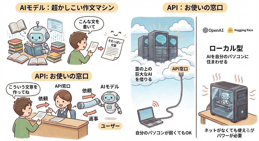 まずは「AIモデル」とか「API」といった言葉にビビらないための、やさしい下ごしらえからいきますね。AIモデルはかんたんに言うと “超かしこい作文マシン” みたいなものです。たくさんの文章を勉強していて、「こんな文を書いて」とお願いすると、それっぽい文章をスッと作ってくれます。