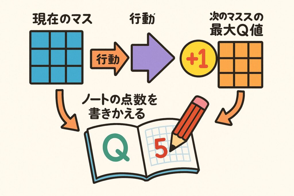 というイメージだけ持っておけば大丈夫です。数式はあとでゆっくり理解すればOKで、まずはこの“ノートづくり”の感覚がつかめれば強化学習の半分はクリアと言っていいレベルです。