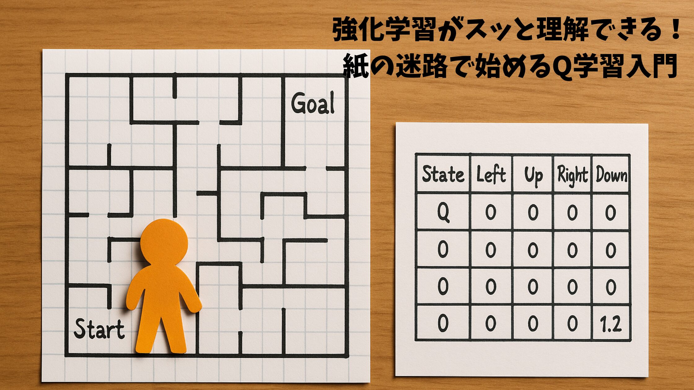 でも実は、強化学習の本質って 「ゲームで遊びながらコツをつかむ」 みたいな、とってもシンプルなしくみなんです。そこでこの記事では、いきなり数式に飛び込むのではなく、まずは 紙に描いた簡単な迷路 を使って、“手で触れるように”理解していただくスタイルで進めます。