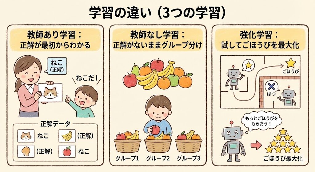 強化学習を理解する前に、よく聞く3つの学習タイプをざっくりイメージしておくとめちゃ楽です。