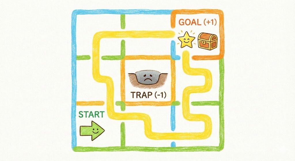 エージェントは、うまくゴールに近づくと**報酬(ごほうび)**をもらえます。逆にワナに落ちるとマイナスのポイント。これを何度もくり返すうちに「あ、この道のほうが得だ!」と少しずつ覚えていきます。