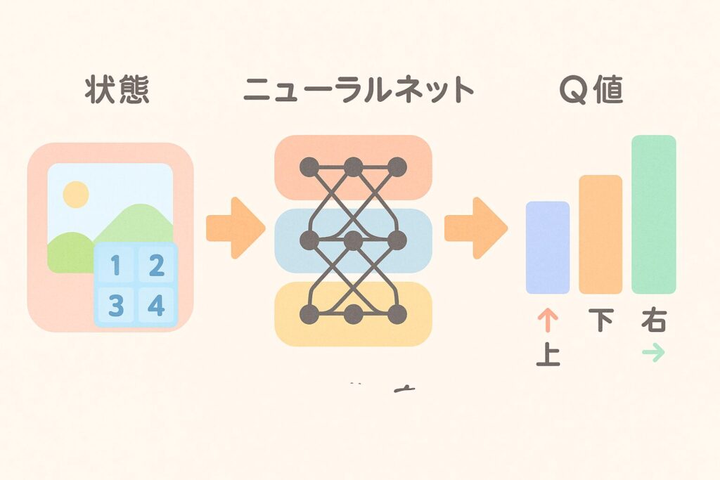 そこで登場するのが DQN(Deep Q-Network) です。これは、Qテーブルの代わりに ニューラルネットを使って「Q値を予測する」 方法なんです。つまり、表の代わりに“頭脳そのもの”を作るイメージです。