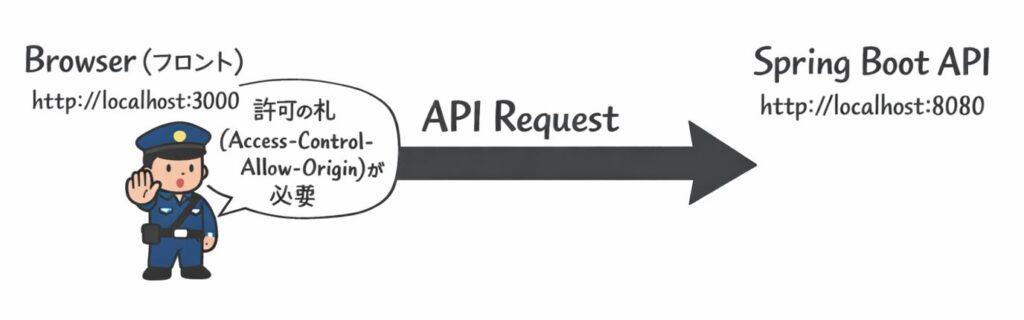サーバーがレスポンスで、たとえば Access-Control-Allow-Origin: http://localhost:3000 みたいに許可の札を返すと、ブラウザは「OK、通ってよし!」になります。
